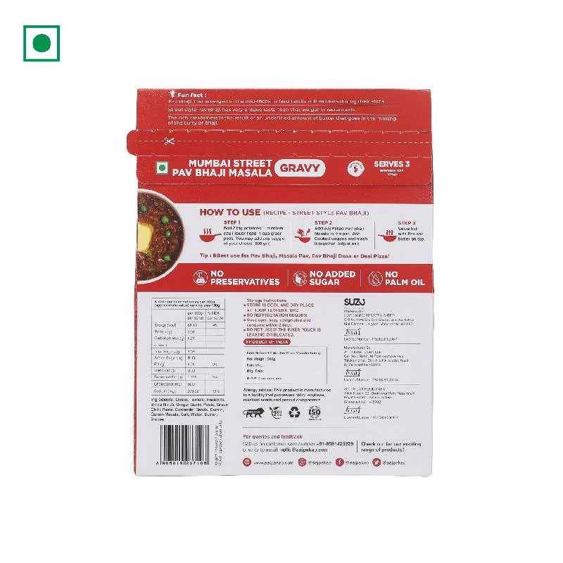 300g Pavbhaji base masala gravy, authentic Mumbai style in aseptic packaging. One packet serves 2-3.