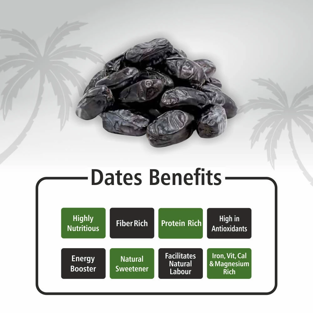 2 Indulge in the authentic flavors of UAE with our choicest deseeded black dates. These dates are mildly sweet & are so soft & tender, they feel like they melt in your mouth. Kids just love it.