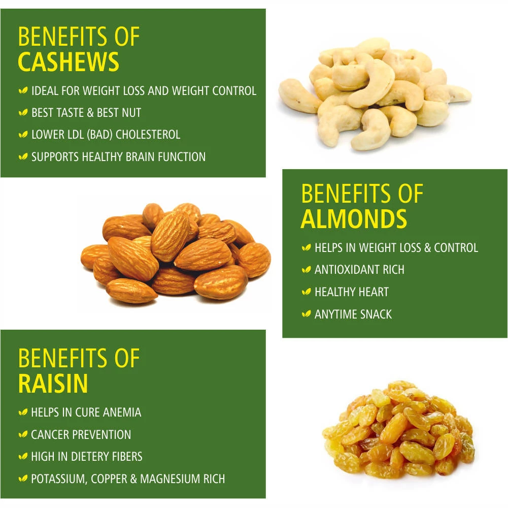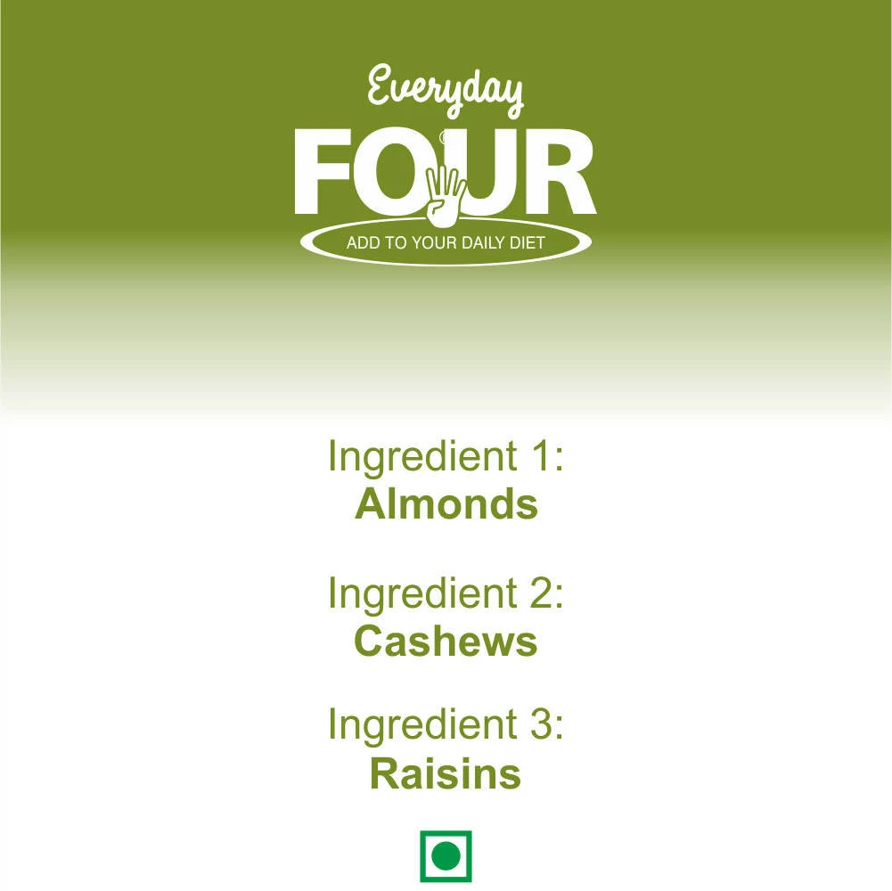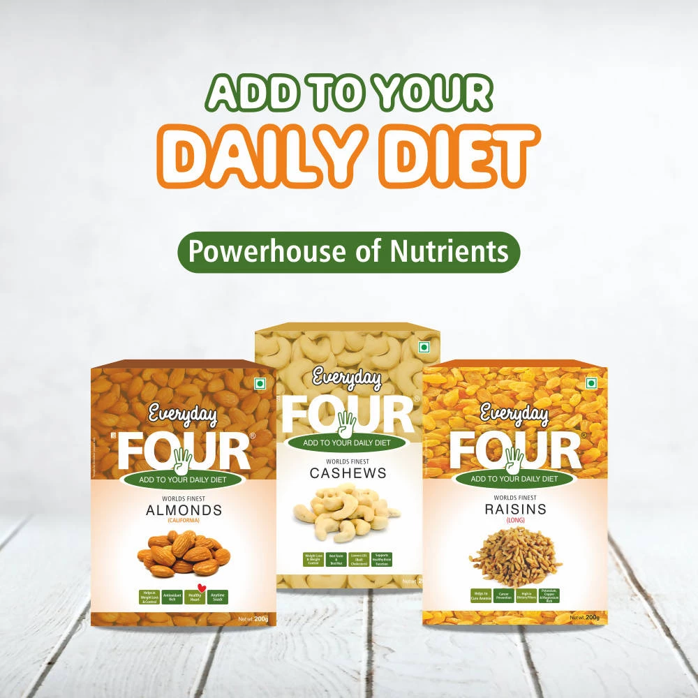 2 This Combo pack includes Everyday Four California Almonds -200g, best & tasty Raw Cashews Nuts-200g and Long Nasik’s Raisins-200g.