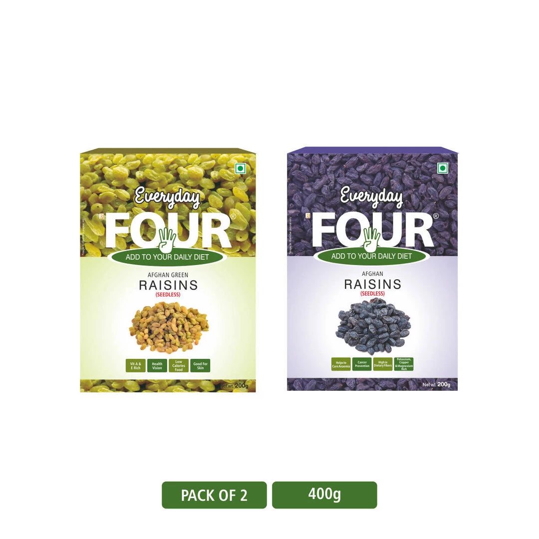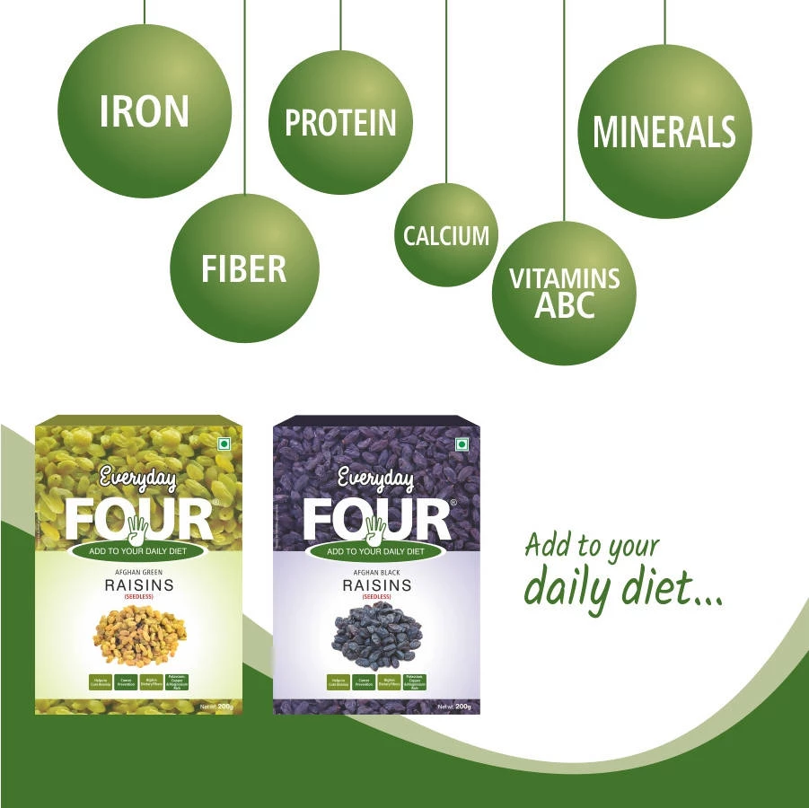 1 Everyday Four Green & Black Raisins are Superior & Finest quality Seedless Raisins from Afghanistan.
