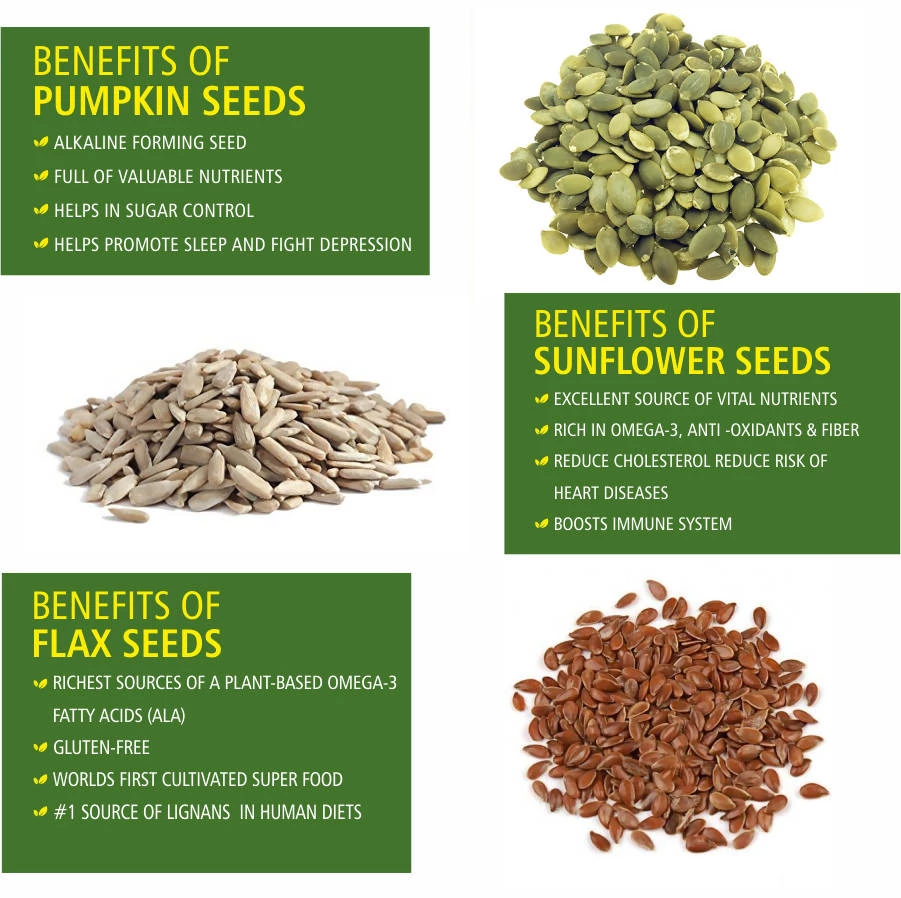 1 In this combo pack you get the health benefits of Raw Pumpkin, Raw Sunflower and Raw Flax.