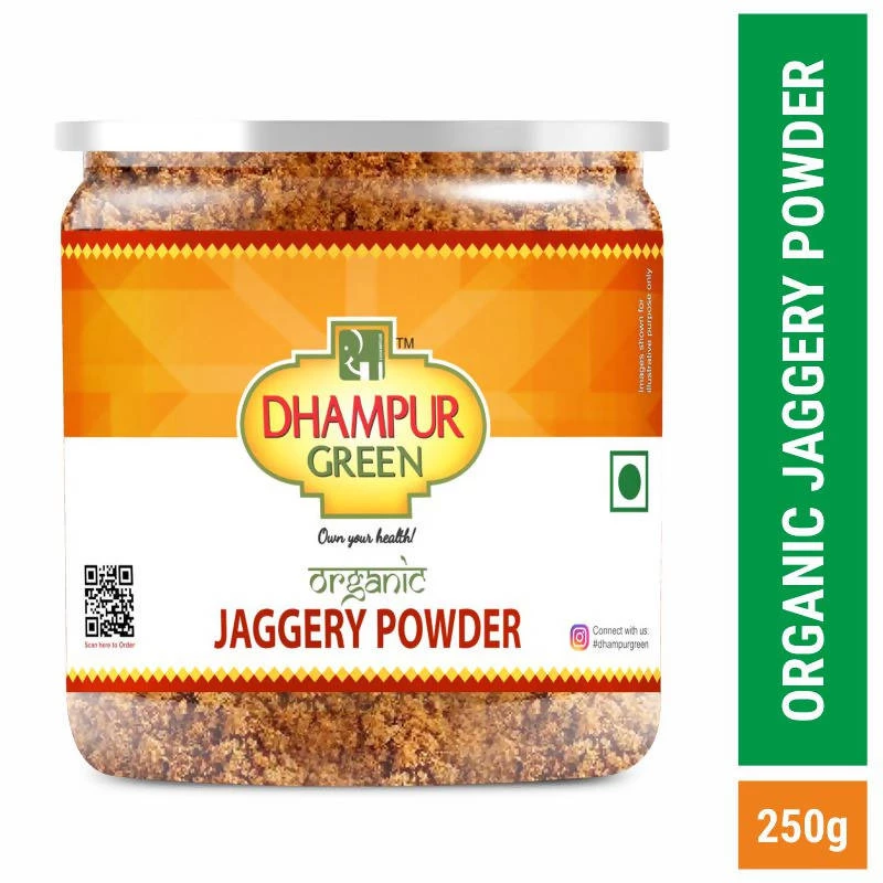 Desi Gur Shakkar, certified organic, non-crystalline concentrated sugarcane juice with natural brown color and a rich liquorice – like flavor. Dhampur Green has complete farm to folk traceability. Jaggery Powder, certified organic, is processed with at most care without any chemicals/ fertilizers/ clarificants or pesticides. Brown colour and soft texture is derived from evaporation of sugarcane juice resulting in yellow to dark brown shakkar. Because of simple processing jaggery powder retains minerals, Micronutrients and vitamins, so recommended for centuries as sweetener for healthy living.