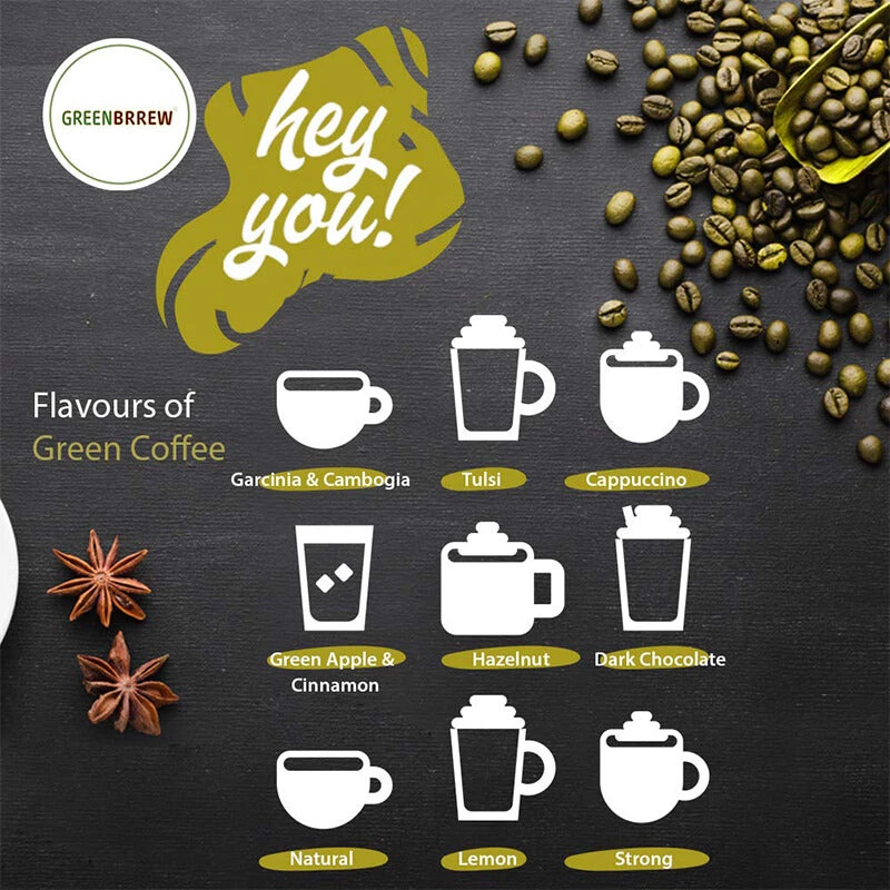 - Natural Source of Antioxidants with 5 Luxurious Flavors of Green Coffee (Dark Chocolate, Cappuccino, Hazelnut, Garcinia Cambogia, Green Apple & Cinnamon).