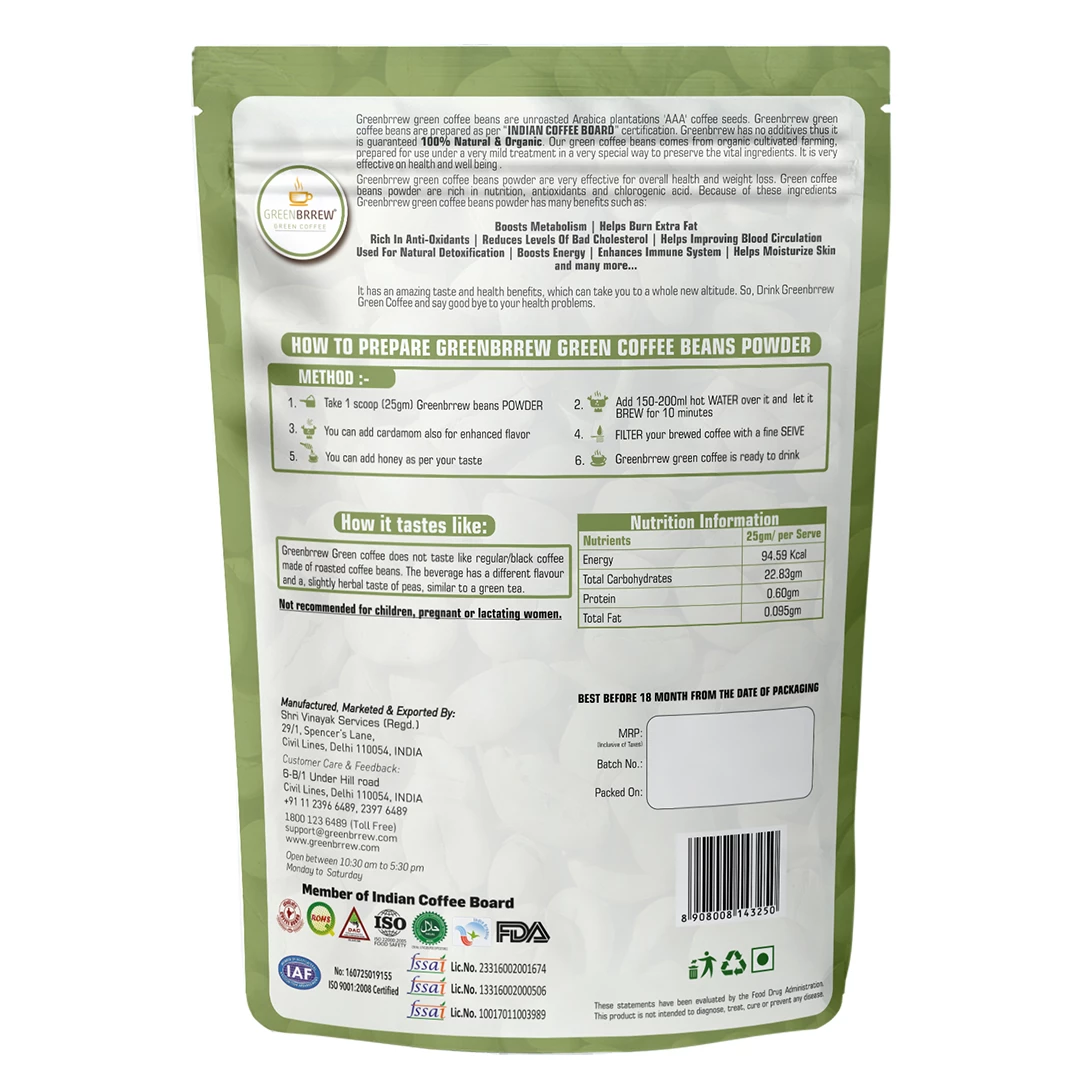 Greenbrrew brings you the finest green coffee beans without roasting the essential compounds of the coffee. Our beans are raw and directly from selected plantations in Karnataka. For the consumer who but not has time and means to crush the beans, we recommend our green coffee beans powder.Â