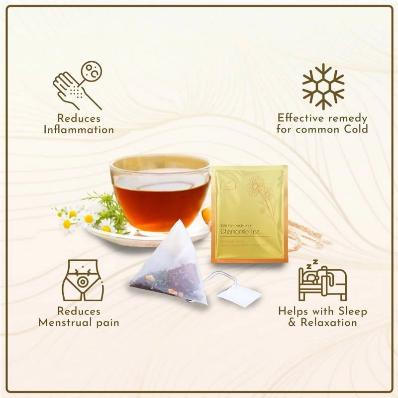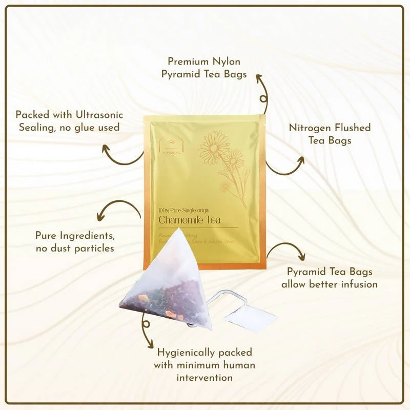 Chamomile flowers look pretty and like daisies. The tea infusion has a golden yellow colour, and the taste is natural, floral, refreshing, and sweet. The flowers used in the making of the tea are harvested at the right time, during summers. So, when you make this floral infusion, you can expect only the best. You can feel the warm, floral taste of the flowers on your taste buds for sure.