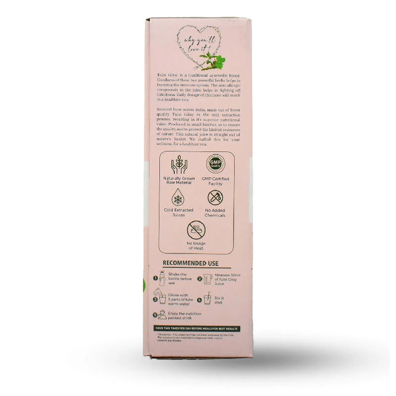 Regular consumption of Natural Tulsi Giloy Juice can improve your immune response. Furthermore, it can be used to help fight existing ailments like cold, flu, hay fever, etc. Tulsi Giloy is great for maintaining respiratory health and for fighting off conditions like arthritis and gout.
