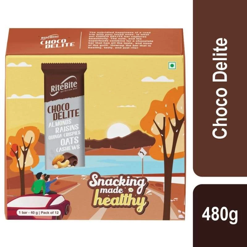 CHOCO DELITE BAR: Offers a rich wave of chocolate that serves your cravings just right. Mixed with the crunchy bits of almonds & cashews along with the goodness of golden raisins.