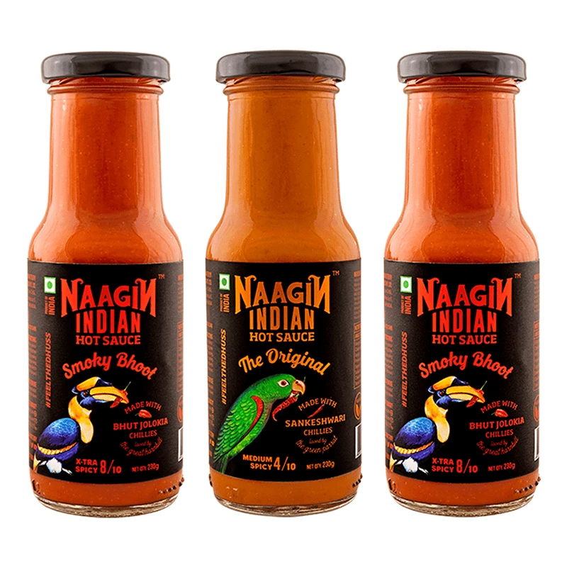 Naagin Original hot sauce is a medium-spicy blend highlighting the best flavours from Western India. A full-bodied uplifter of the bland, it has a base of tomatoes, onions and garlic, perfectly combined with Sankeshwari and Bhavnagri chillies to bring you a little kick. “The rich-textured Naagin Bhoot hot sauce?s unique flavour comes from North-East India?s legendary Bhut Jolokia chilli. The flavour is built on a base of celery, onions and garlic, before the heat slowly creeps up on you to delight and torment your taste buds in equal measure.