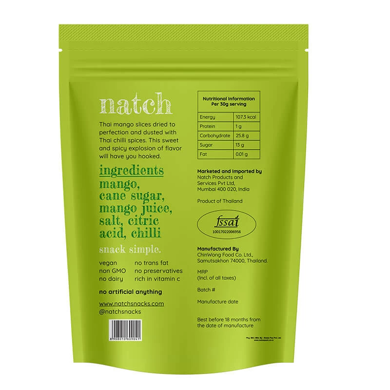 Thai mango slices dried to perfection and dusted with Thai chilli spices. (Gluten Free, Vegan, Dairy Free, with no artificial colors or preservatives)