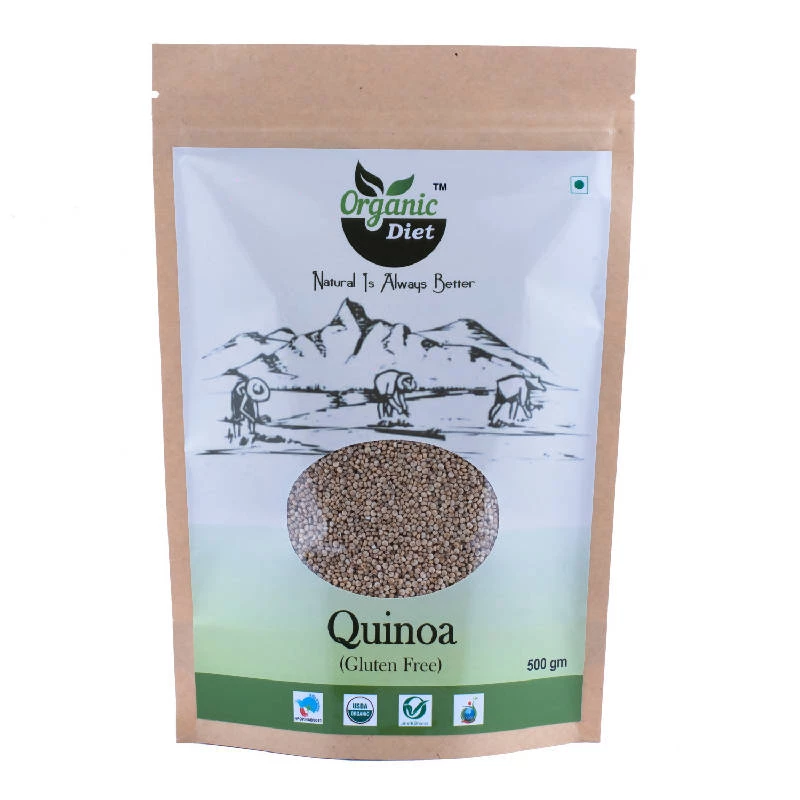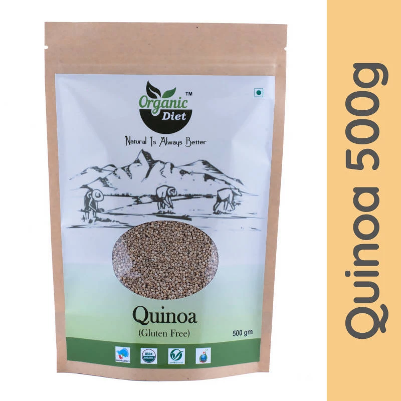 Organic Diet Quinoa has certified organic Quinoa which is a complete protein having all nine amino acids, essential for building bones, muscles, cartilage, skin and blood. Double the fiber content than most other grains. Quinoa is good for digestion, helps lower cholesterol and blood glucose levels.