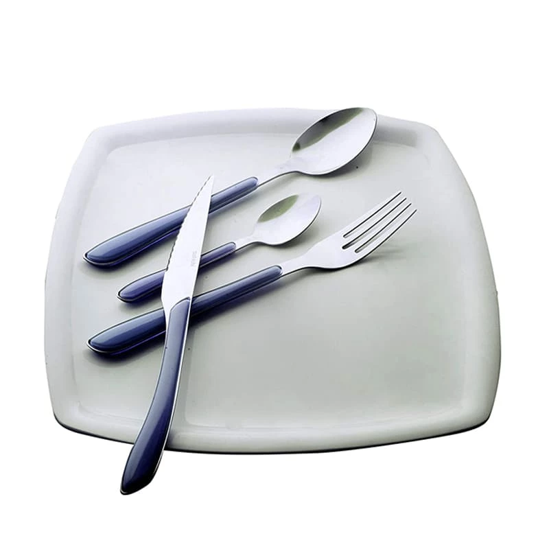 Roma Sky blue 24-piece cutlery set. The Roma 24-piece cutlery set features a stylish ridged design with a soft pastel colour decoration on the handles which is sure to add a touch of flair to your table.