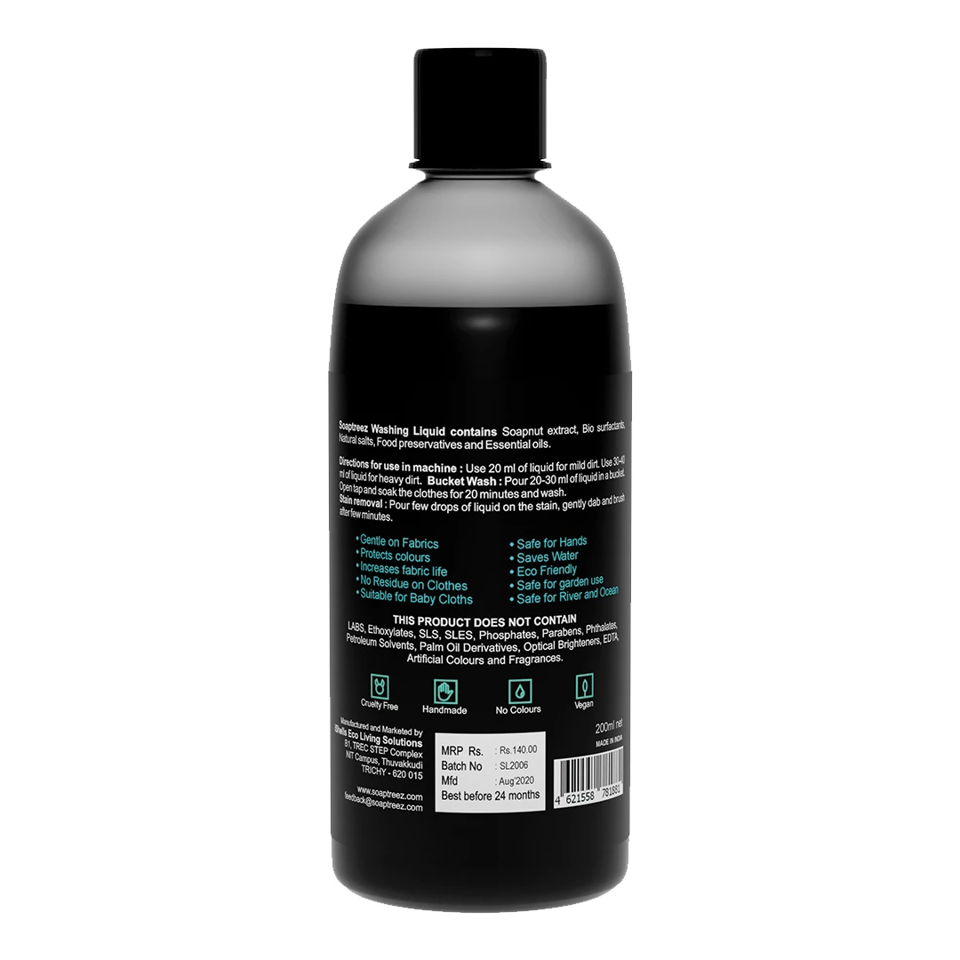 It can be used for washing by hand and by washing machines. Soaptreez laundry liquid is designed in such a way that it can be used in both front loading and top-loading washing machines. Since it contains fabric softener, no additional fabric softener is required. Soaptreez laundry liquid contains natural antimicrobial agent which removes the germs from your clothes. Being a liquid, it does not clog the washing machine tubes and drain outlets. So it minimizes cleaning the washing machine often. Since it contains natural ingredients, it is biodegradable. So it is safe for our waterways and so it is eco friendly too.