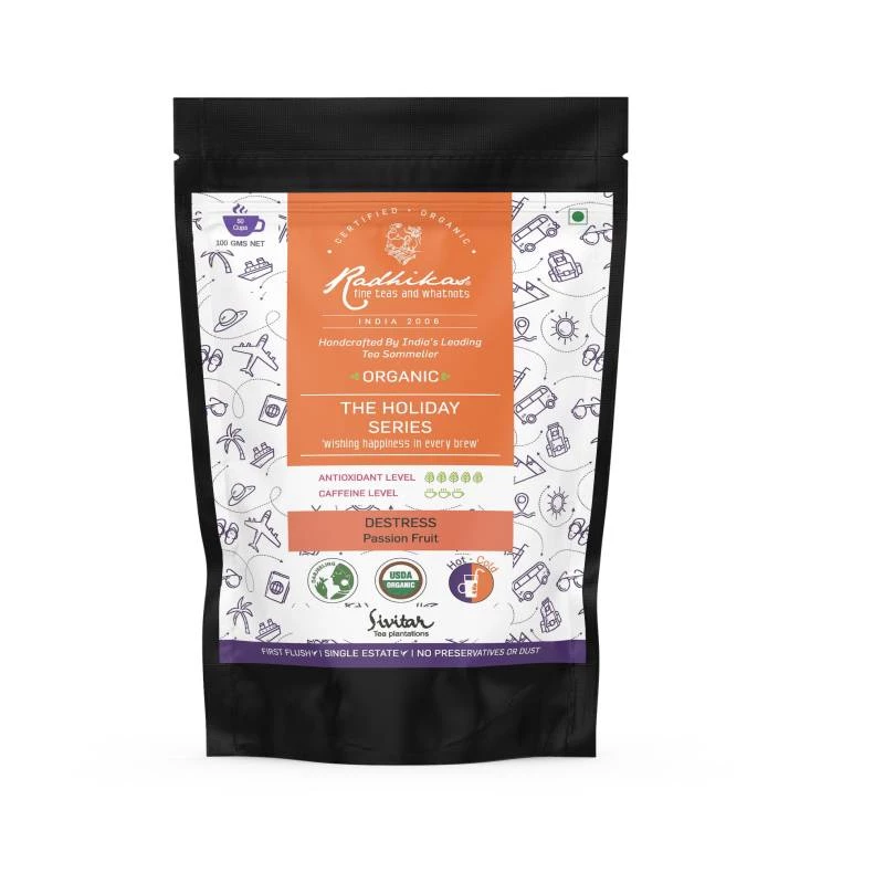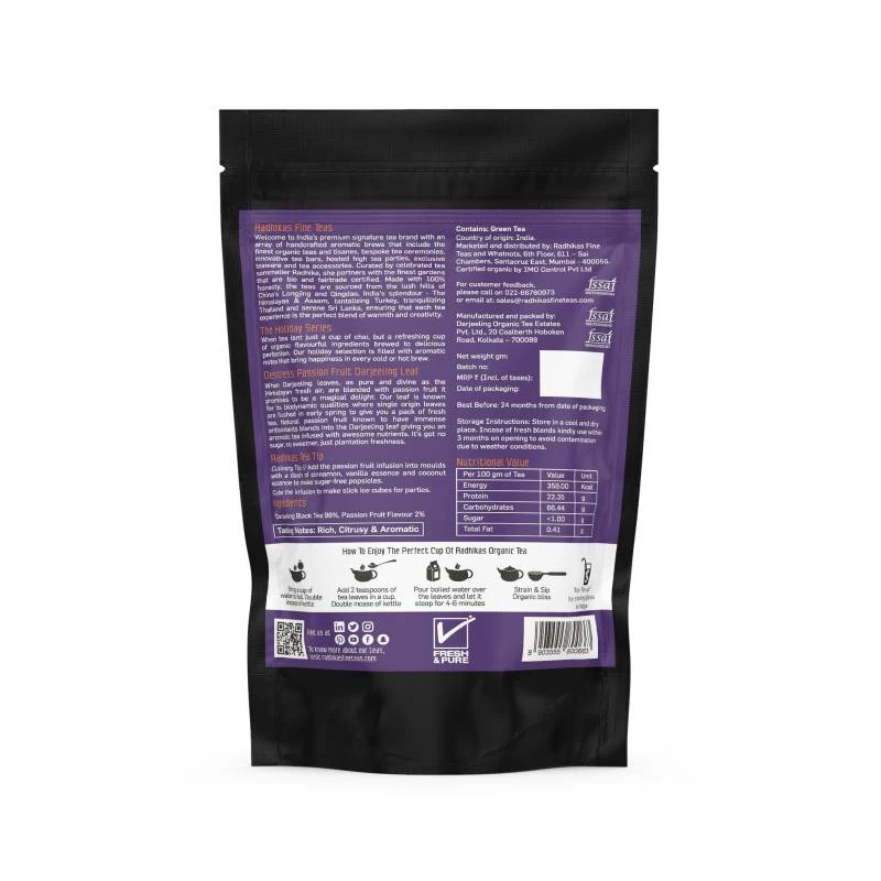 When Darjeeling leaves, as pure and divine as the Himalayan fresh air, are blended with passion fruit it promises to be a magical delight with Radhikas Fine Teas. Our leaf is known for its biodynamic qualities where single origin leaves are flushed in early spring to give you a pack of fresh tea.