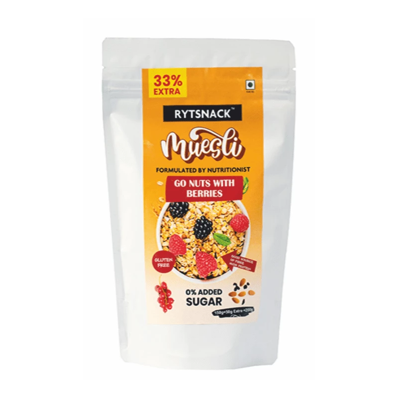 PERFECT BREAKFAST & SNACK OPTION IF YOU ARE WORKING FROM HOME.Rytsnack go nuts muesli comes with loads of almonds, cranberries,seeds like pumpkin,melon,chia etc to make high protein,high fiber breakfast .