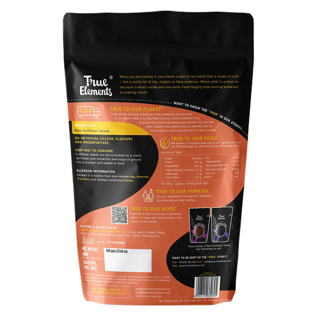 True Elements Raw Sunflower Seeds are purely natural and unprocessed, extracted from a sunflower in its pure form.