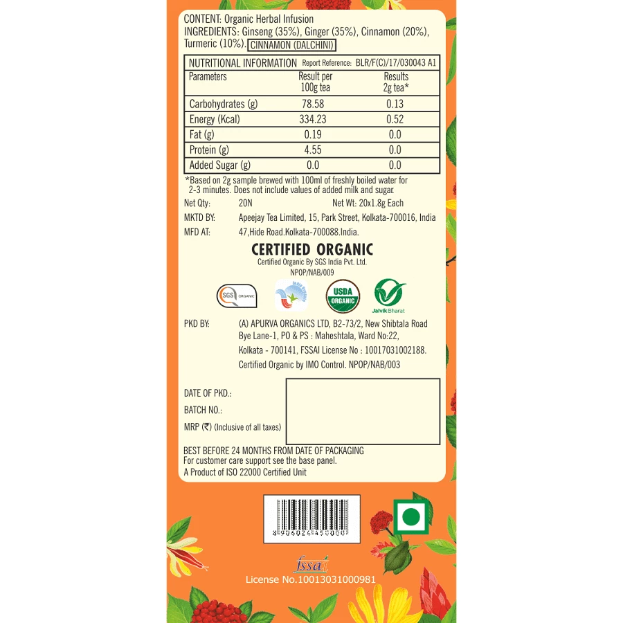 The strong yet round notes of indian ginsent root combined with turmeric & ginger are flavourful with naturally support. ginseng, cinnamon, turmeric and ginger.