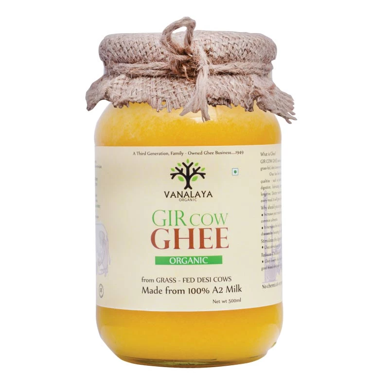 Gir Ghee (Pure A2 Gir Cow Ghee) is made from milk collected from grass-fed desi Gir cows. These cows are grass-fed and are not factory-farmed and are free from cross-breeding, which gives our Ghee its special, natural qualities. We prepare Desi-Ghee by traditional method. This Vedic method is the best process to prepare Desi-Ghee. Vanalaya A2 Ghee made of pure Gir Cow milk with the nutrient-preserving ?Bilona Churning Process? is superior in quality and nutrition content compared to ordinary ghee. A2 milk has optimum levels of omega 3 and omega 6 fatty-acids which is beneficial in making the brain, heart, nervous system and eyes. The traditional method of making ghee (bilona) is quite elaborate. Cow’s milk is boiled and cooled. Then a spoonful of curd is added to this milk and kept at room temperature overnight. The curd is then churned to extract butter from it. This butter is then boiled so that the water evaporates leaving behind pure ghee.