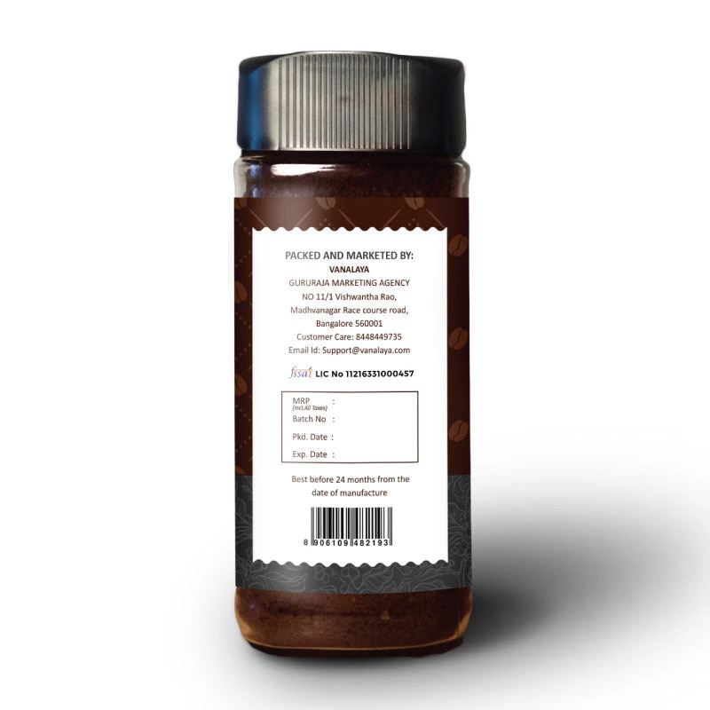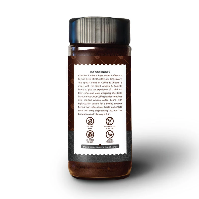 Vanalaya Southern Style Instant Coffee is a Perfect Blend of 70% coffee and 30% chicory. This special Blend of Coffee & Chicory is made with the finest Arabica & Robusta beans to give an experience of traditional filter coffee and leave a lingering after-taste in your mouth.